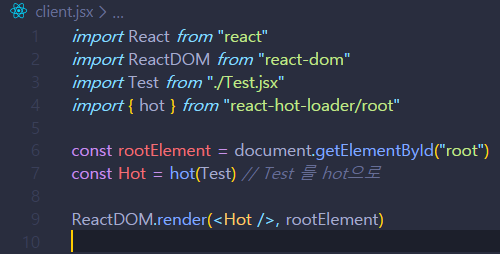 다음과 같이 hot-loader를 적용해줍니다. (hot-loader import할때 root 을 꼭 붙이셔야 합니다!)