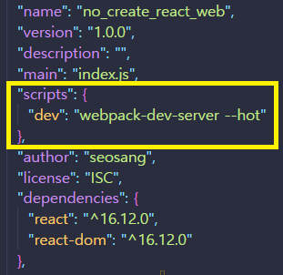 우리는 앞으로 webpack-dev-server 를 이용해 구성을 할 것이므로 package.json 에서 빌드 방식을 변경해주어야 합니다.