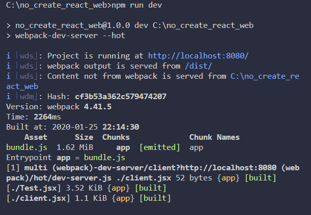 이제는 webpack 이아닌 webpack-dev-server --hot(옵션) 으로 서버를 이용해 구성하겠다는 뜻입니다.