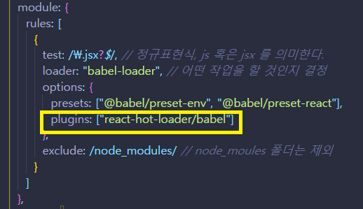 바벨 로더 플러그인 부분에 react-hot-loader를 추가해줍니다.