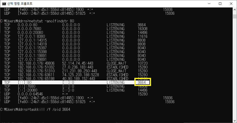 3. taskkill /f /pid (종료할 pid) 를 입력하여 특정 pid를 가진 연결을 종료시킨다.