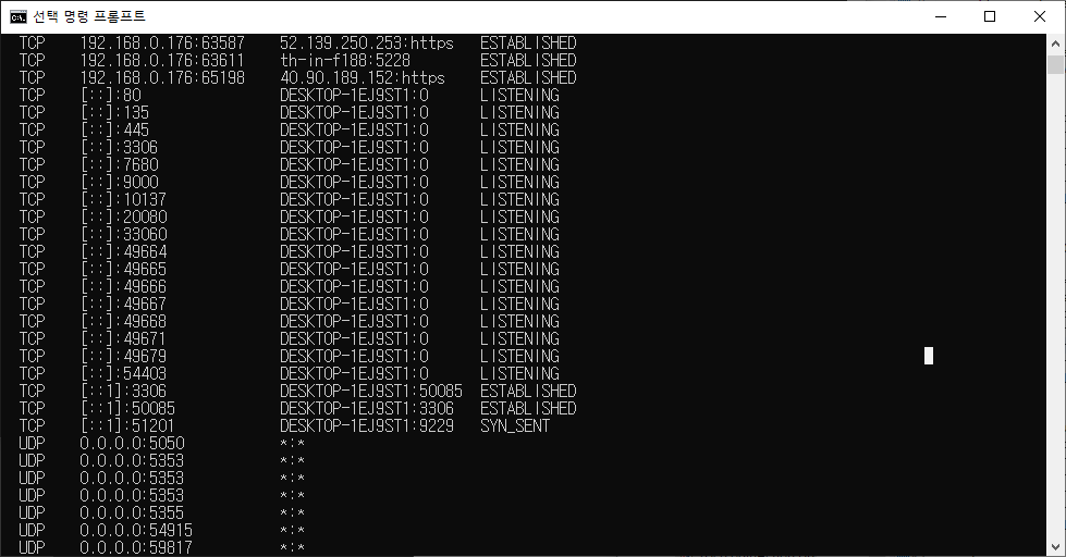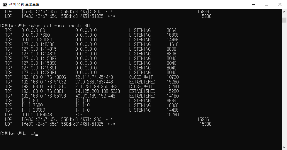 (혹은 netstat -an | findstr:"포트넘버") 를 통해 특정한 포트넘버를 직접 찾을 수도 있다.