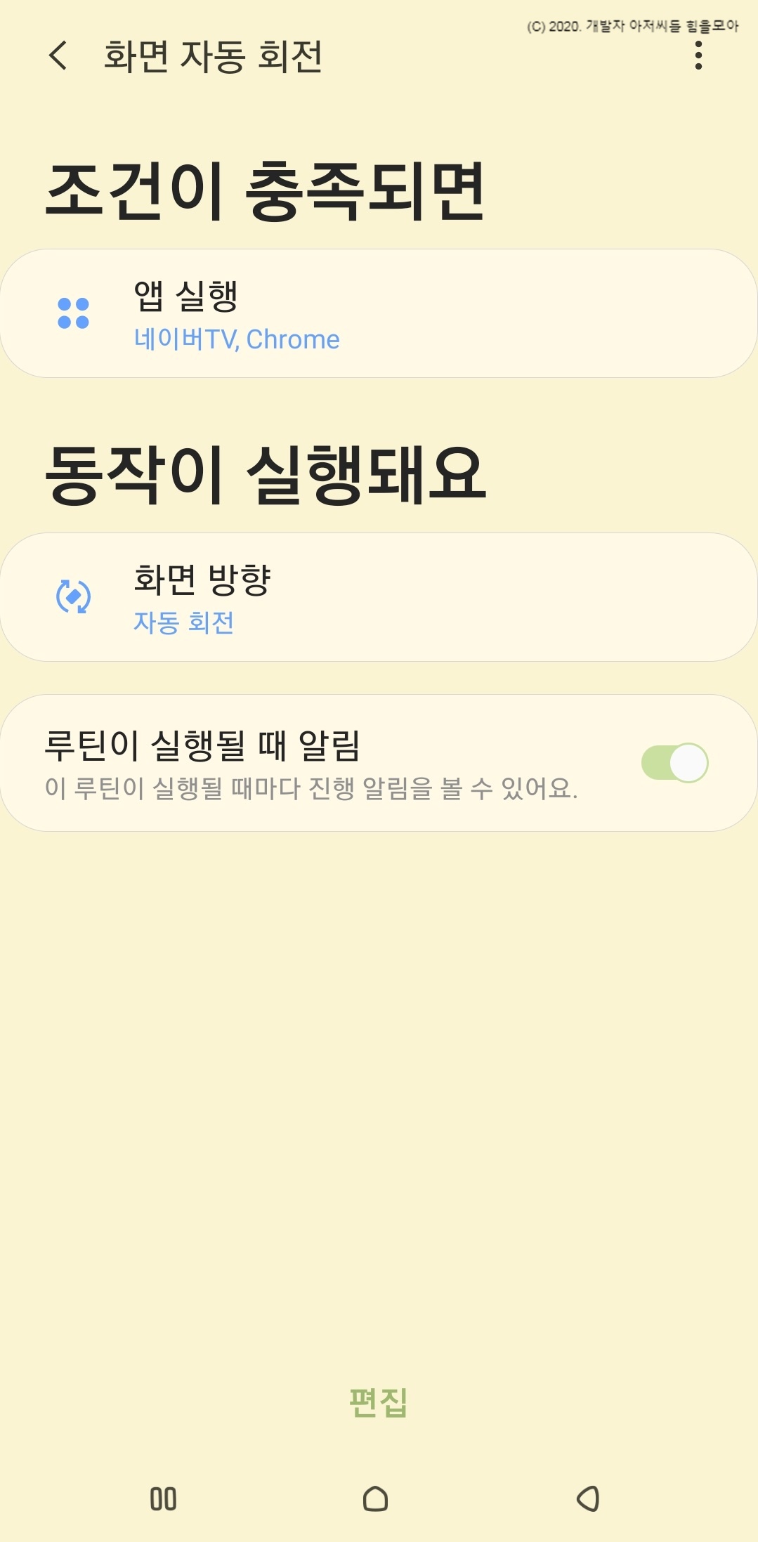 * 자동회전이 실행되려면 빅스비 루틴이 지원 가능한 기종이어야하며 빅스비 루틴이 활성화 되어 있어야 합니다.