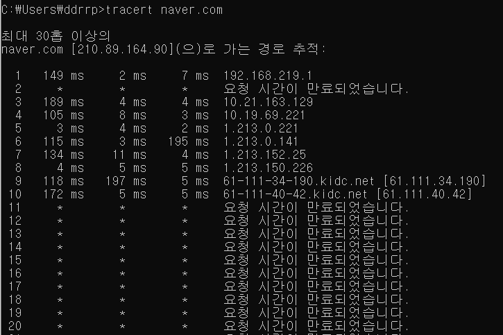 언뜻 출력값만 보기에는 naver.com 서버에 해당하는 IP까지 한번에 쭉~~~ 가면서 그 경로 IP를 바로바로 반환하는거처럼 보이죠. 하지만, 직접 해보시면 알겠지만 속도가 매우 느려요. tracert 작동방식에 그 비밀이 담겨있습니다.