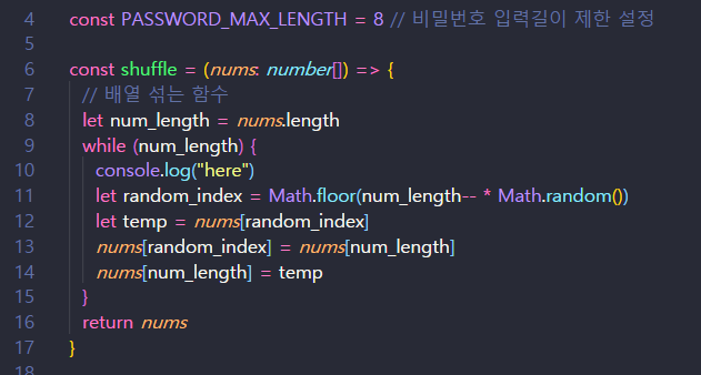 shuffle 함수는 랜덤한 인덱스를 설정해 그 인덱스와 각 인덱스의 위치를 바꾸는 방식으로 배열을 섞어줍니다.