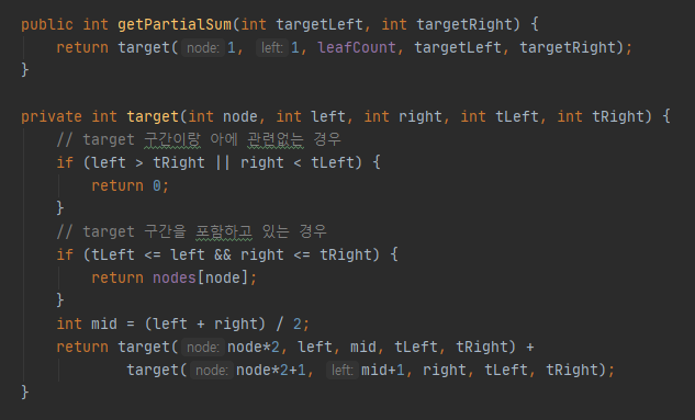 재귀적으로 왼쪽, 오른쪽 순으로 들어가면서 만약 내가 구하고자 하는 구간에게 완전히 포함당하고 있는경우, 더해줍니다.