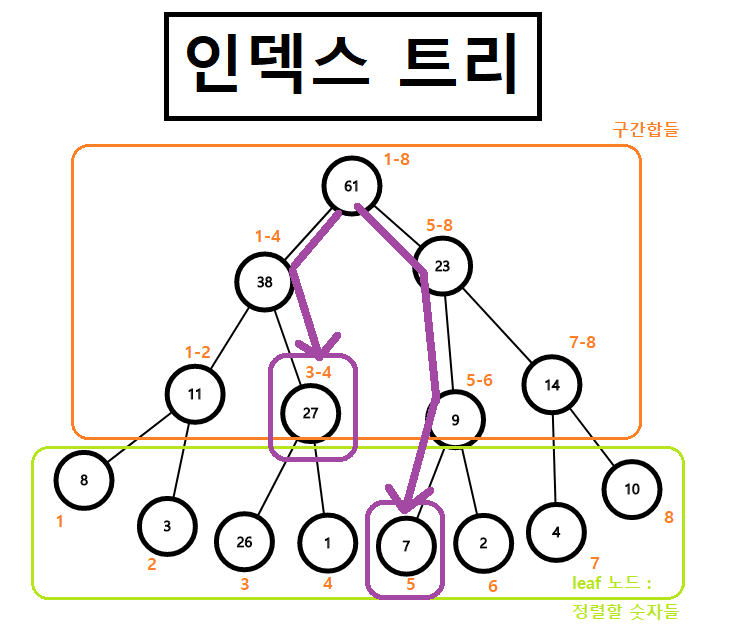 우선 위의 그림처럼 이 배열을 이용해 인덱스 트리를 구성합니다.