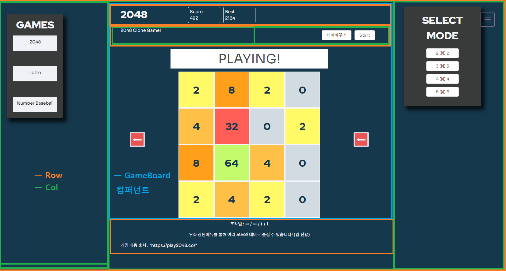 Ant Design 에서는 기본적으로 Row 와 Col 을 지원해서 Grid 시스템을 쉽게 쓸수 있게 해줍니다. 저는 다음과 같이 레이아웃을 나눠보았습니다. 게임에 관한 요소들이 들어있는 Game2048Board 라는 자식 컴퍼넌트로 따로 빼주고, 나머지는 Col 과 Div 를 이용해서 나눴습니다.