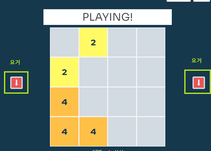 이제 키를 입력받아서 구현해뒀던 함수들을 쓸 수 있게 만들어봅시다. 방향키를 누르면 그에 따라 게임판이 바뀌고, 아래 사진처럼 게임판 양쪽에 있는 전광판에 무슨 키를 눌렀는지도 나오게 해볼거에요!