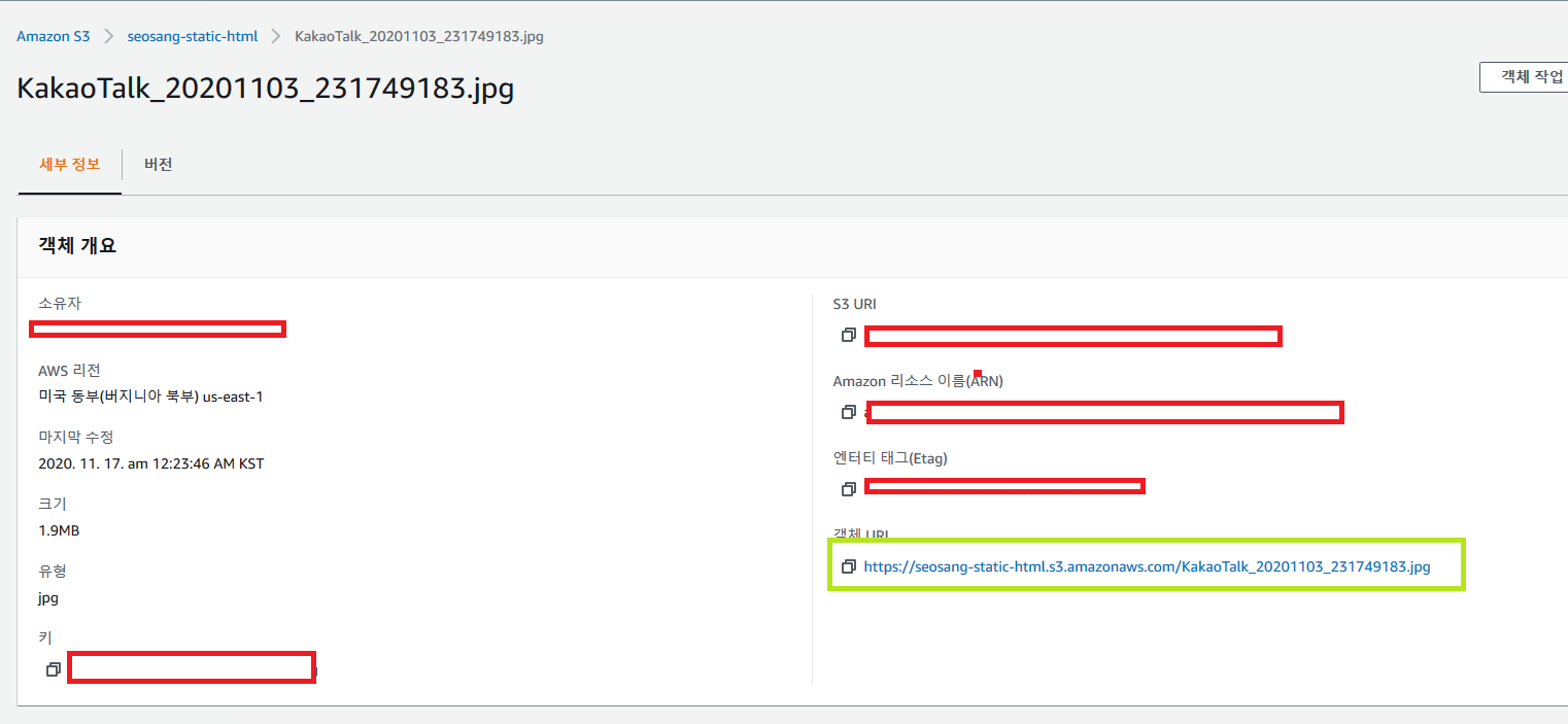 버킷에 돌아가서 사진을 클릭해보면, 접근 가능한 URI를 확인 가능합니다.