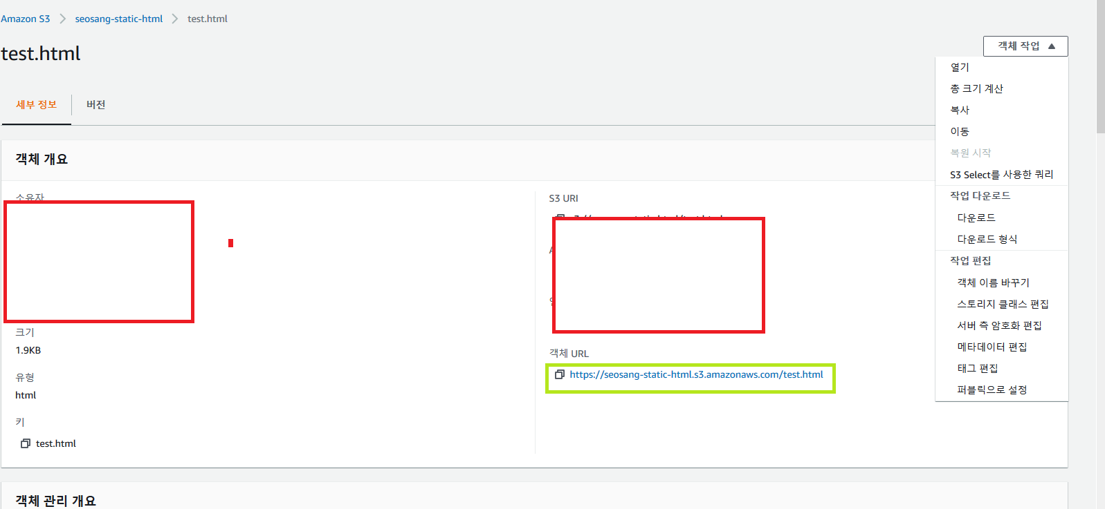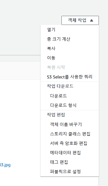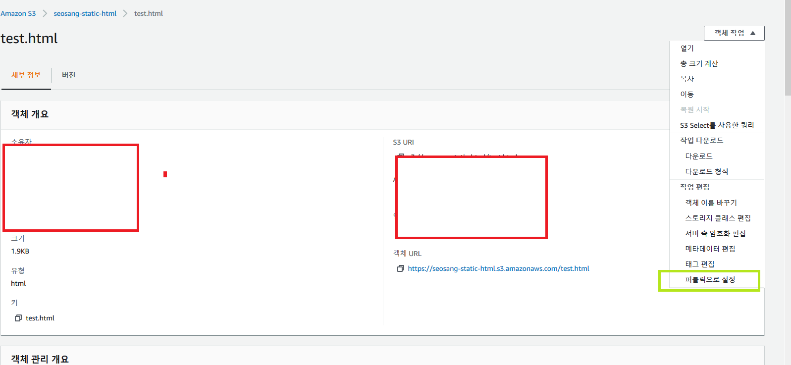 생성 직후에는 퍼블릭 액세스가 차단돼있으므로, 우측 상단 객체작업 버튼을 통해 '퍼블릭으로 설정'을 클릭해줍니다.