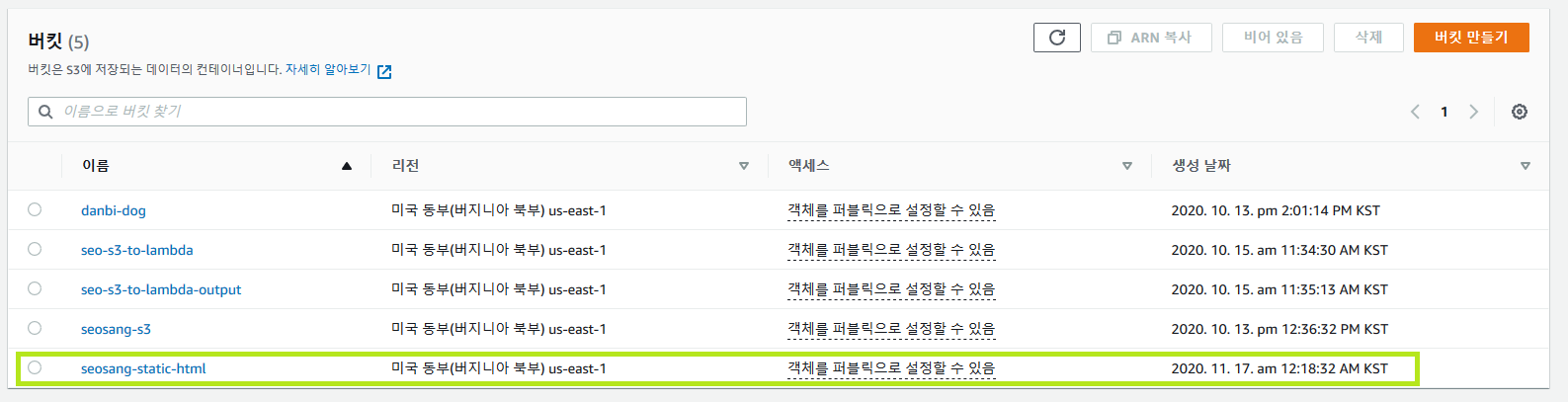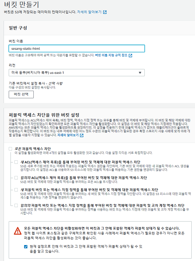 버킷이란 지난 포스팅에서 말했듯이 하나의 데이터를 담을 공간을 뜻합니다. 저희 html 페이지와 사진을 담을 버킷을 만들어줍니다! 이름은 마음대로 지어주시고, 저희는 테스트용이니 퍼블릭 액세스 차단을 풀어주세요! (주요 개인정보는 올리시면 안됩니다😁)