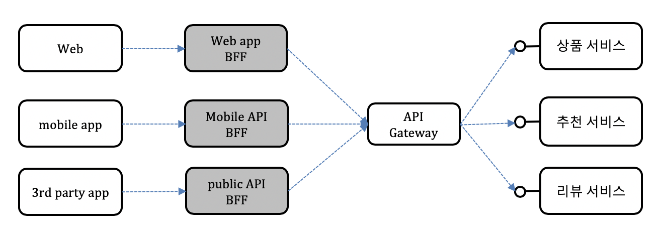 마이크로 서비스에서는, 이런 클라이언트 별로 각양각색인 요구사항에 특화된 처리를 하기 위해 BFF 패턴을 주로 이용한다. 앞서 API 게이트웨이로 진입하기 전에, 각 클라이언트에 맞는 서버를 하나 더 두는 방식이다.