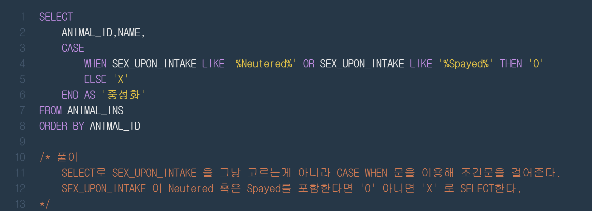| [프로그래머스💯] 코딩테스트 연습 > String, Date > 이름에 el이 들어가는 동물 찾기 (0) | 2019.09.22 |
