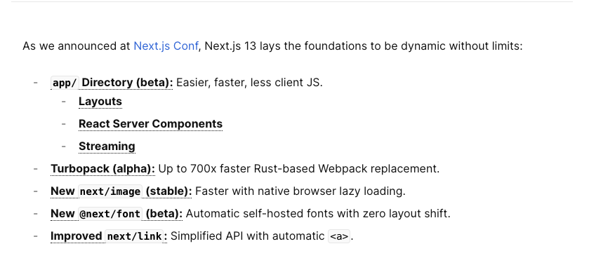 중요한 부분은 1번과 2번이죠. app/ 기반 디렉토리 구조로의 변경, 그리고 Turbopack 도입 입니다.