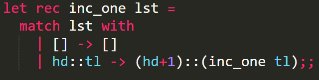 * :: 는 리스트에 원소 1개를 넣는 연산자이다. (리스트 끼리는 ::를 쓸 수 없으므로 [hd+1] :: (inc_one tl) 은 오류가 난다.