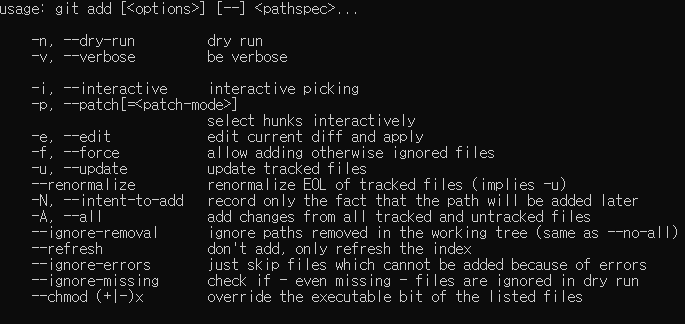 * git add -h 를 입력하면 git add의 도움말을 볼 수 있습니다.