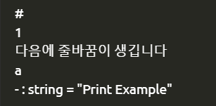 print_endline("내용") : 파이썬에 print , 자바의 println 과 비슷한 함수로 내용을 출력 한 후 줄바꿈이 자동으로 들어간다. 내용 타입은 반드시 string 타입을 써야한다.