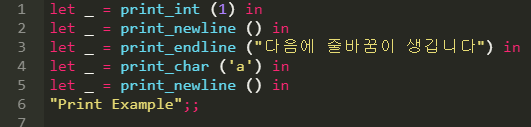Ocaml 에서는 print 관련된 구문도 함수 자체로 여겨진다. 따라서 let prt = print_endline("abc") in 을 쓰면