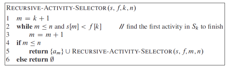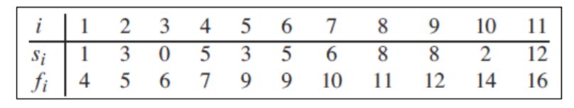 Input : activity 집합 의 시작 시간, 종료 시간. (s_i, f_i)