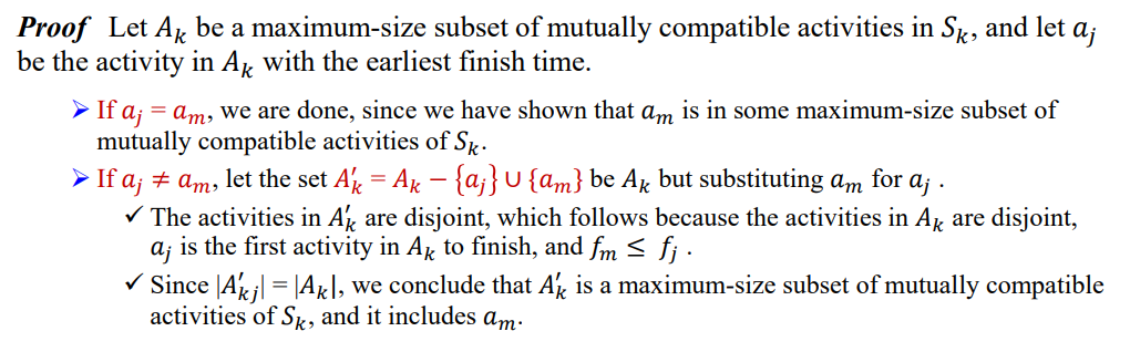 만약 활동1을 포함하지 않는 다른 최적의 해가 있다고 치자. 그 최적의 해는 최소한 4초 이후에 끝나는 활동 하나는 했을 것이다. 그런데 그 활동은, 활동1로 대체해도 똑같다!