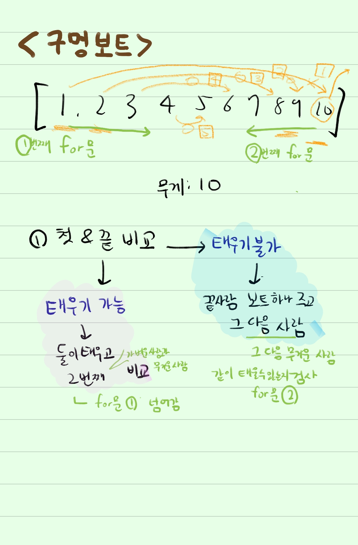 => 무거운사람에게 1인용 보트를 준 후(boat +=1) 방금 검사했던 가벼운사람과 그 다음 무거운 사람을 다시 검사합니다.